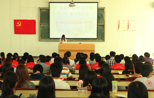 2011年11月5日下午,学生党建工作委员会在励志楼B208组织开展了“学风、校风、教风”建设倡议会。学生党建工作委员会书记招韵雯老师、指导老师陈伯兴老师、上届常务副书记蔡丽冰、副书记刘嘉洋、秘书长刘晓穗,各学生党支部副书记及党员代表共250多人参加了倡议会。