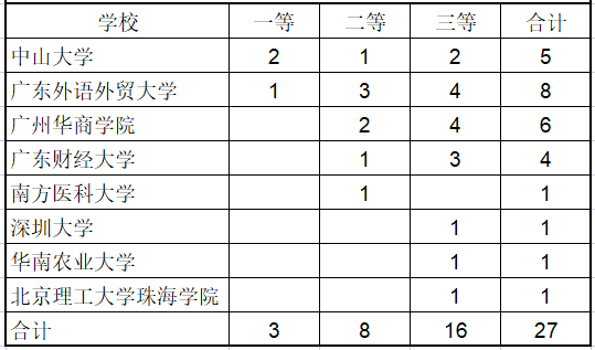 竞赛结果,广东省高校共获得27个奖项,是全国高校获奖最多的省份之一。27个奖项全部集中在8个高校之中,我校获国家二等奖2项,国家三等奖4项,总成绩位列广东省高校第三、广东省民办高校第一。其中:我校经济贸易学院朱芳芳副院长和金莹老师指导的施佳婵、罗敏、王葆权团队,韩兆洲副校长指导的李楚楚、潘思宇、叶胜林团队等2支队伍在此次比赛中获得国家二等奖。刘照德和石立、朱芳芳、赵慧琴老师等指导的4支队伍获得国家三等奖。