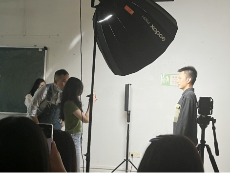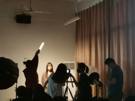 工作坊讲座的实训环节,王灏总监讲解到抖音起号十大技巧的最后一点——做氛围感时,用专业设备实践如何拍摄出一条氛围感的抖音短视频,伟德国际betvlctor教师赵安琪老师与博沃公司摄影师辅助王灏总监手把手教学学生如何打光与环境布置,同学们积极踊跃地担任摄影主角和上手拍摄中。