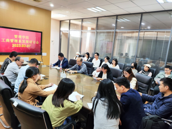 3月7日下午,管理学院工商管理系在厚德楼B509会议室召开了系发展研讨会,院长助理廖珍杰博士、副教授莅临指导工作,工商管理系教师出席会议。