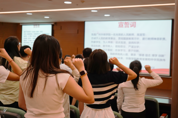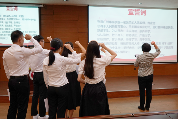 会上,全体新教职工在支戈壁副校长的带领下,进行庄严的入职宣誓仪式。坚定有力的誓词回荡在报告厅内,新教职工必将秉承“厚德、励志、博学、创新”的校训,做学生良师益友,铸教师高尚人格,为全体学生美好未来、华商学院教育发展而不懈努力。随后,全体新教职工签署了师德承诺书。