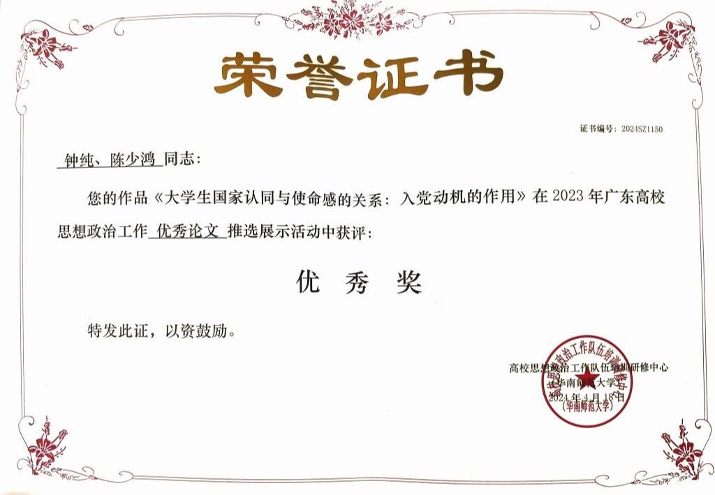 《大学生国家认同与使命感的关系:入党动机的作用》 | 优秀奖 |